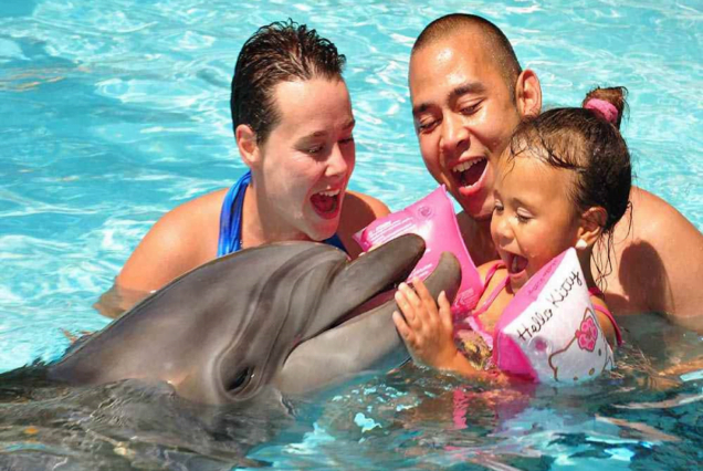 You’ll enjoy 15 minutes of fun, dancing, and swimming with the dolphins in a pool. The group will be divided into two, with 7 participants per group, each paired with two dolphins and two instructors. The trainer will guide you on how to interact with the dolphins, making this a safe and educational experience.