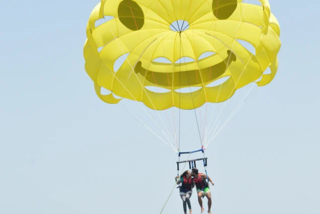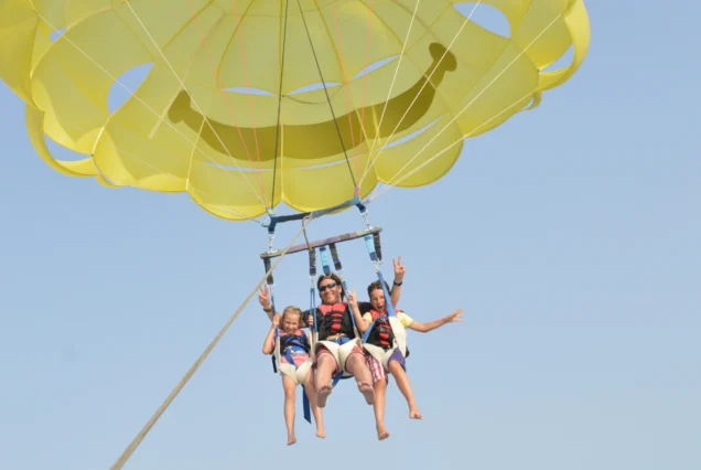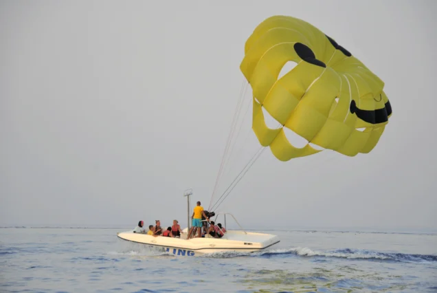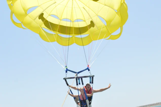 Upon arrival at the beach, you will receive a brief instruction on parasailing. After everyone wears a life jacket, you’ll take off for a thrilling 5-7 minute ride above Sharm El Sheikh. You can choose to go solo or share the experience with a partner (maximum weight 150 kg for double parasailing).